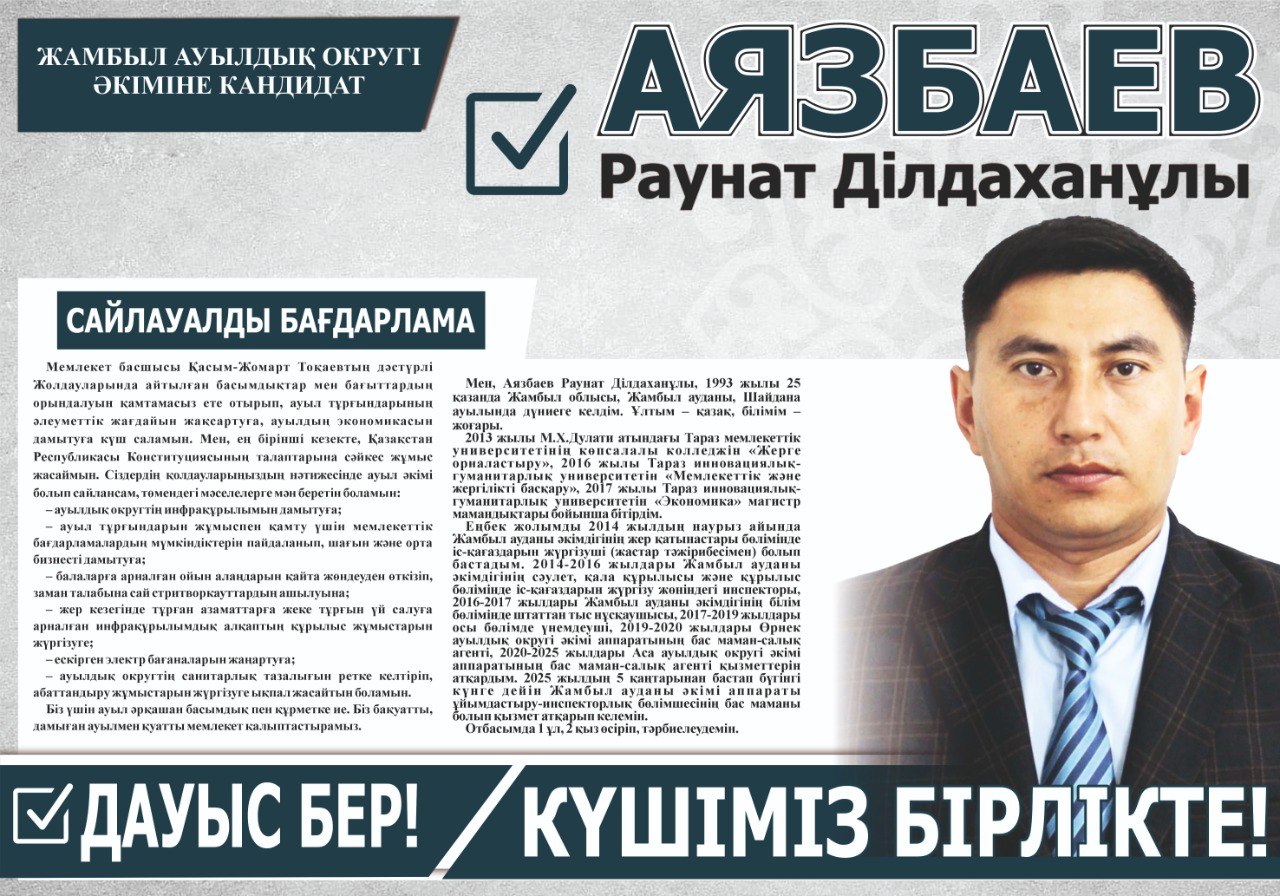 Саясат Аязбаев Раунат Ділдаханұлы On Май 13, 2025 263 Share Тапсырыс беруші: Жамбыл ауылдық округі әкіміне кандидат Р.Д.Аязбаев. Жамбыл аудандық аумақтық сайлау комиссиясы қаражаты есебінен төленді. 263 Share