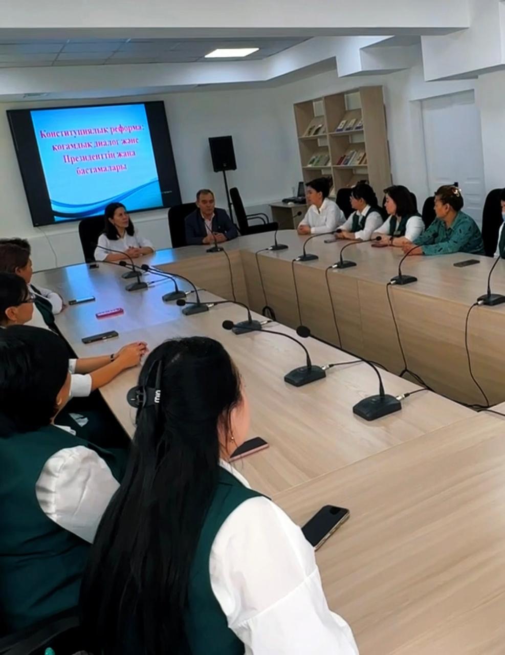 🔹Жиынға арнайы штаб мүшелері қатысып, конституциялық реформалардың негізгі бағыт-бағдарын түсіндірді. Олар өзгерістердің мән-маңызына тоқталып, ел дамуы мен қоғам өміріндегі рөлі туралы жан-жақты ақпарат берді. Сонымен қатар қатысушылар өз пікірлерін білдіріп, ұсыныс-ойларымен бөлісті.