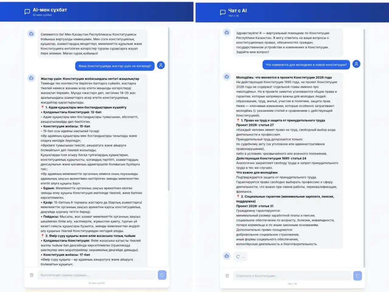 Елімізде «Халықтық Конституция қарапайым сөздермен» деп аталатын цифрлық платформа іске қосылды. Жобаны «AMANAT» партиясы фракциясының мүшесі, Мәжіліс депутаты Әбутәліп Мүтәлі таныстырды. Бұл – Қазақстан Республикасы Конституциясындағы өзгерістерді түсінуге және негізгі заңның әртүрлі редакцияларын салыстыруға көмектесетін чат-боты бар AI-сервис.