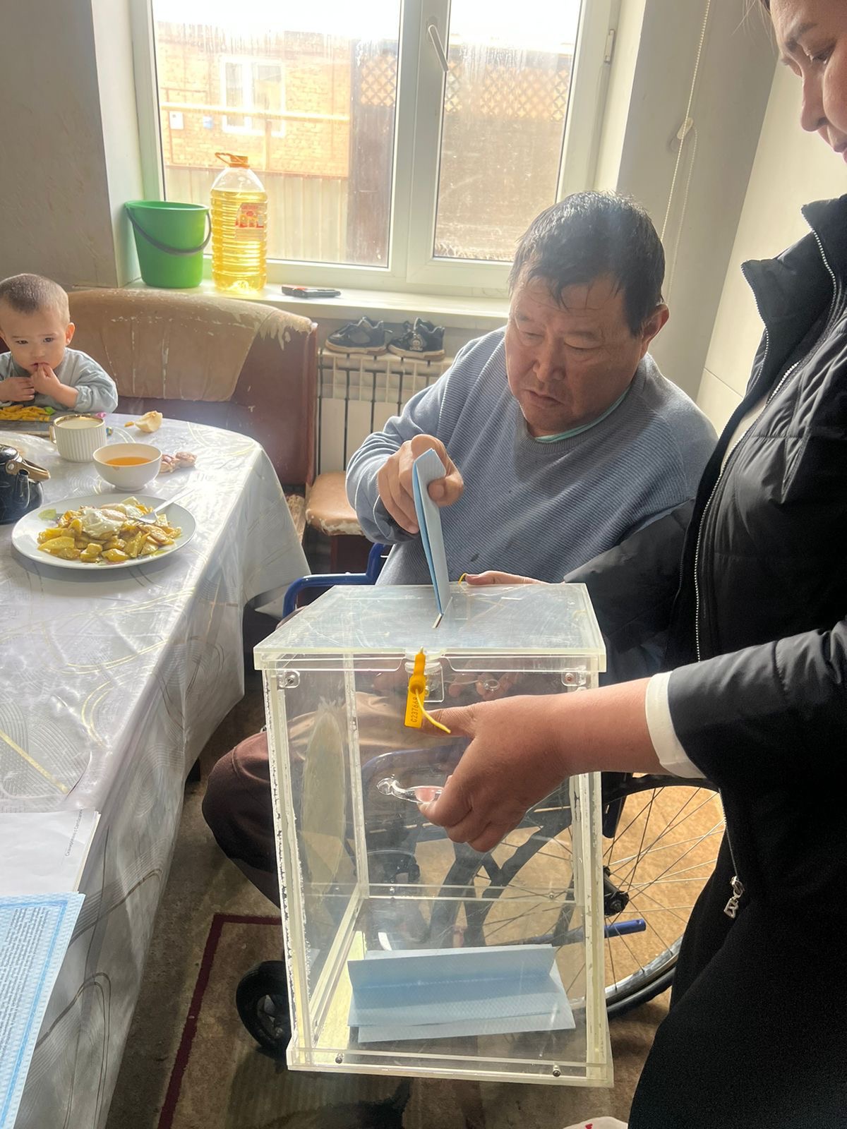 Денсаулығына немесе өзге де себептерге байланысты учаскеге келе алмайтын тұрғындарға қолайлы жағдай жасалып, олардың да өз таңдауын жасауына мүмкіндік берілуде.