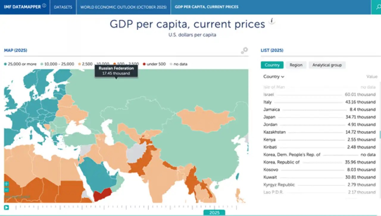 МВФ рассчитывает ВВП на душу населения по текущим ценам, что позволяет оценить общий уровень благосостояния и покупательной способности.