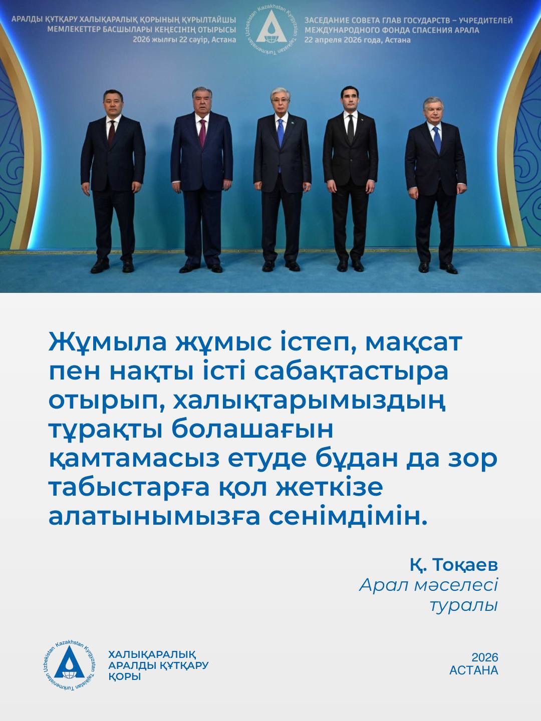 Өңірде су болмаса, Орталық Азия елдерінің де күні қараң. Су жастарымыздың тұрмысын жақсартып, болашағын жарқын етеді. Су – тіршілік көзі. Қ. Тоқаев Арал мәселесі туралы A ХАЛЫҚАРАЛЫҚ АРАЛДЫ ҚҰТҚАРУ ҚОРЫ 2026